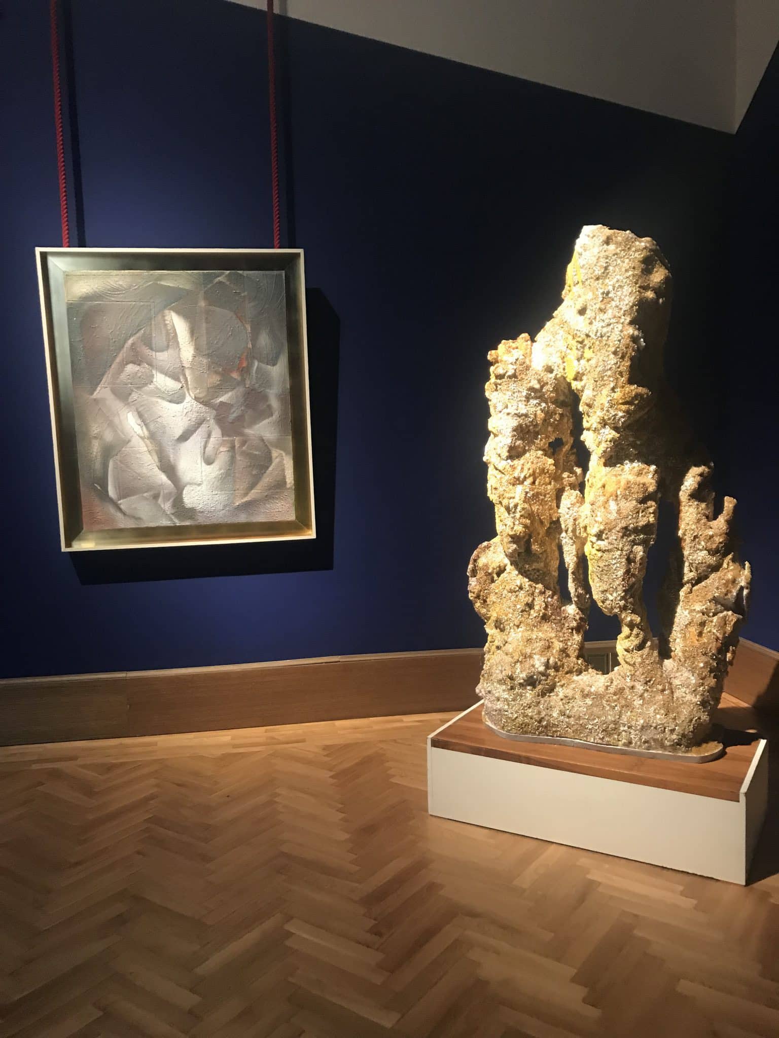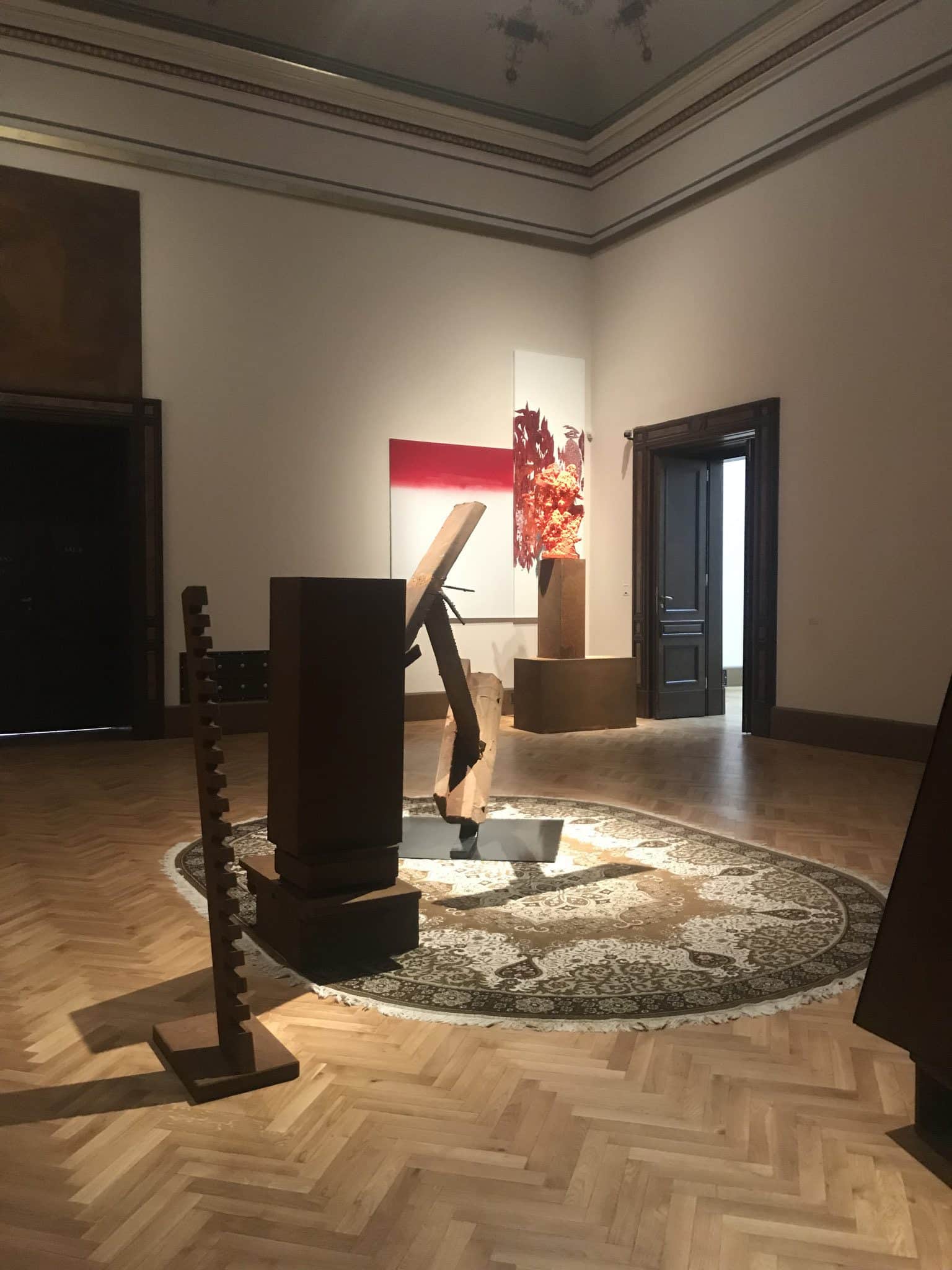 Písařík’s works bring to mind Rauschenberg’s American Pop Art, Murakami’s paintings, and the Early Modernism of Max Ernst and Miro. For example, a head/mask from synthetic grass, looking like an Easter Island statue, or a shipwreck on iron waves along with a sculpture looking like Russian Constructivism. In some pieces, he uses furniture that seems to be from la Belle Epoque. The artist’s playfulness between the monumental and kitsch leaves visitors wondering whether he is admiring the past or mocking it. His poetic works are sharp but not vulgar, questioning intercultural issues, from his faux primitive head to his distant view of the utopias that failed. The artist, a type of “maker,” proposes an interaction between memories and materials, promises and failed promises, and an earnest sense of play.