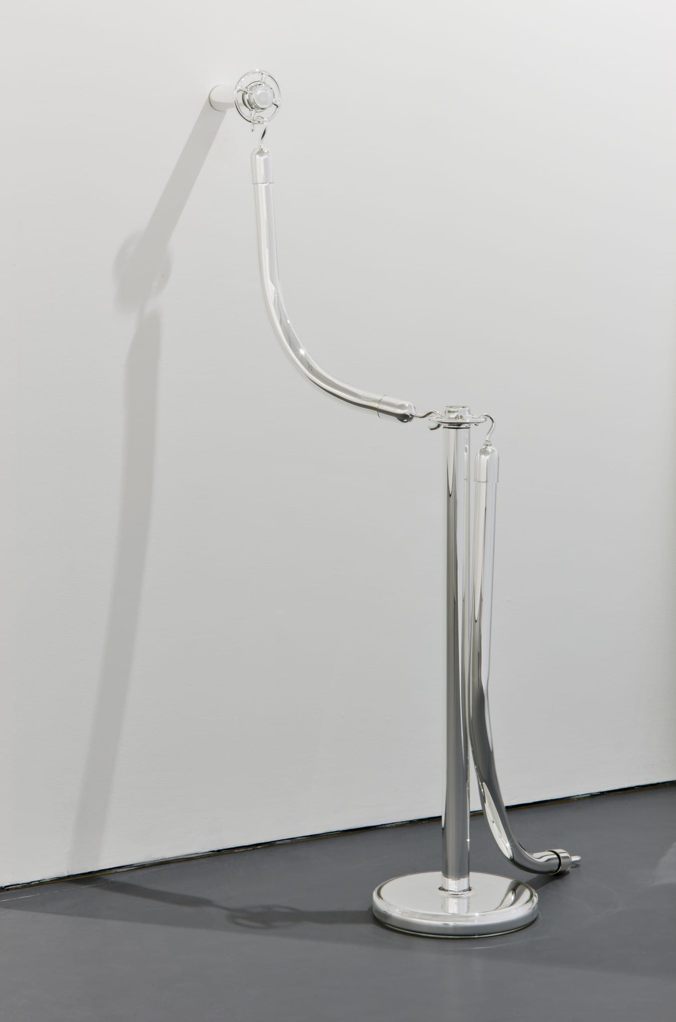 Michael Joo’s 2012 sculpture, Emigrant, looks like abroken stanchion pushed aside. Joo, a Korean-American artist, explores how space defines identities in his series Expanded Access He addresses diverse spatial structures created by pillars and cables, from straight lines to mazes (such as the spaces created in passport control lines).Joo’s stands and ropes are made of mirrored glass, thus viewers find themselves inside of the work, within a system of acceptance and rejection, as the stanchions decide whether people are “in” or “out,” as symbols of authority, the concrete manifestation of power systems.
