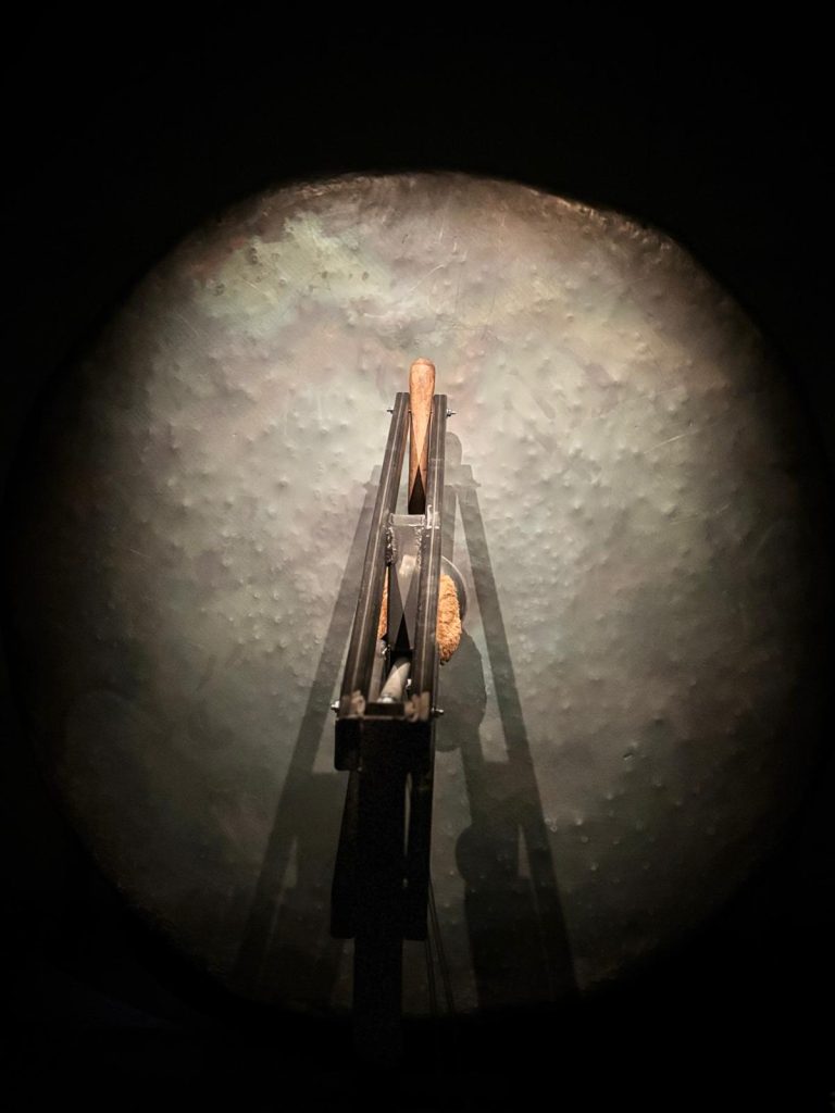 The is a type of beating organism that keeps itself going with the aid of air pressure that operates the bell clapper. The ensuing sound is cyclical, making the gong vibrate as well as those in the space. The echoing is felt in the body, making visitors part of the organism for a moment. Thus, there is a blurring and disruption between living and inanimate.