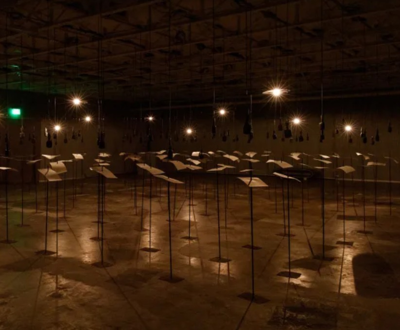 The association is also to Indian artist Shilpa Gupta’s installation For, In Your Tongue, I Cannot Fit (2017-2018), which makes wide use of sound. Gafni’s field of metal stalks bears a similarity to Gupta’s field of stalks and amplifiers. Gupta used extracts from the works of 100 poets persecuted by totalitarian regimes in different countries in her soundtrack, and on sections of poems “skewered” on the metal stakes. At the time, the concept of “making one’s voice heard” became political, as it seems that each sound work embodies a statement about freedom.