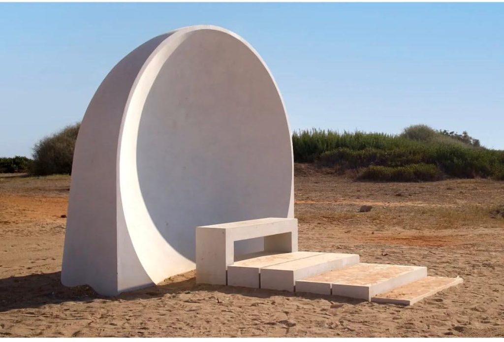 The installation differs from Gafni’s excellent sculpture Rumors (2023), installed on the coast near the Tel Aviv Port but derives from it . The viewer must ascend several steps to sit inside of the white shell, where an isolated “bubble” contains the sounds of the sea. Along with the sight of the open sea, the sculpture forms a place of drawing inwards. If we pause to consider works of Romanticism, such as Caspar David Friedrich’s The Monk by the Sea (1810), one can identify with the ambition to touch the sublime.