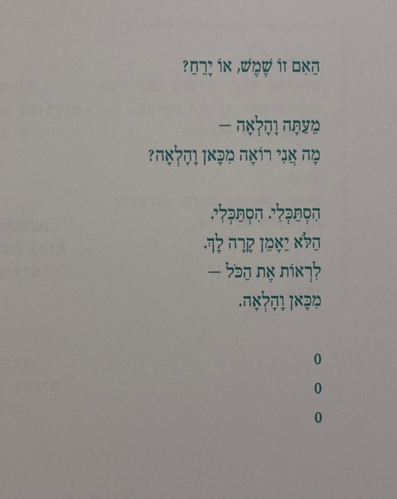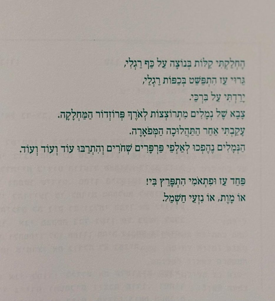 המדבר הלבן שולט גם בעמודי הטקסט הספרותי – קולה של מורן ויקטוריה סבג. חלק מהטקסט שירי, חלקו פרוזה הוא מנוקד ומודפס באותיות ירוקות בפונט עברי קלאסי. הירוק לוקח, בהכרח, למוסכמות שנקשרו עליו כצבע מרגיע ולכן כצבע נפוץ בבתי חולים ובתי חולים לתשושי נפש. הוא צף בלובן הנייר כשהצורניות משתנה – מיקום הטקסט בדף, שירים מדורגים כלפי מעלה או מטה, טקסט כעמודים אנכיים במרכז או צד עמוד, טקסט שהופך את הספר כולו לתנועה – טלטלה שנעצרה. הכתיבה של סבג ישירה, פשוטה ומשרטטת דיוקן, לרוב אמין.