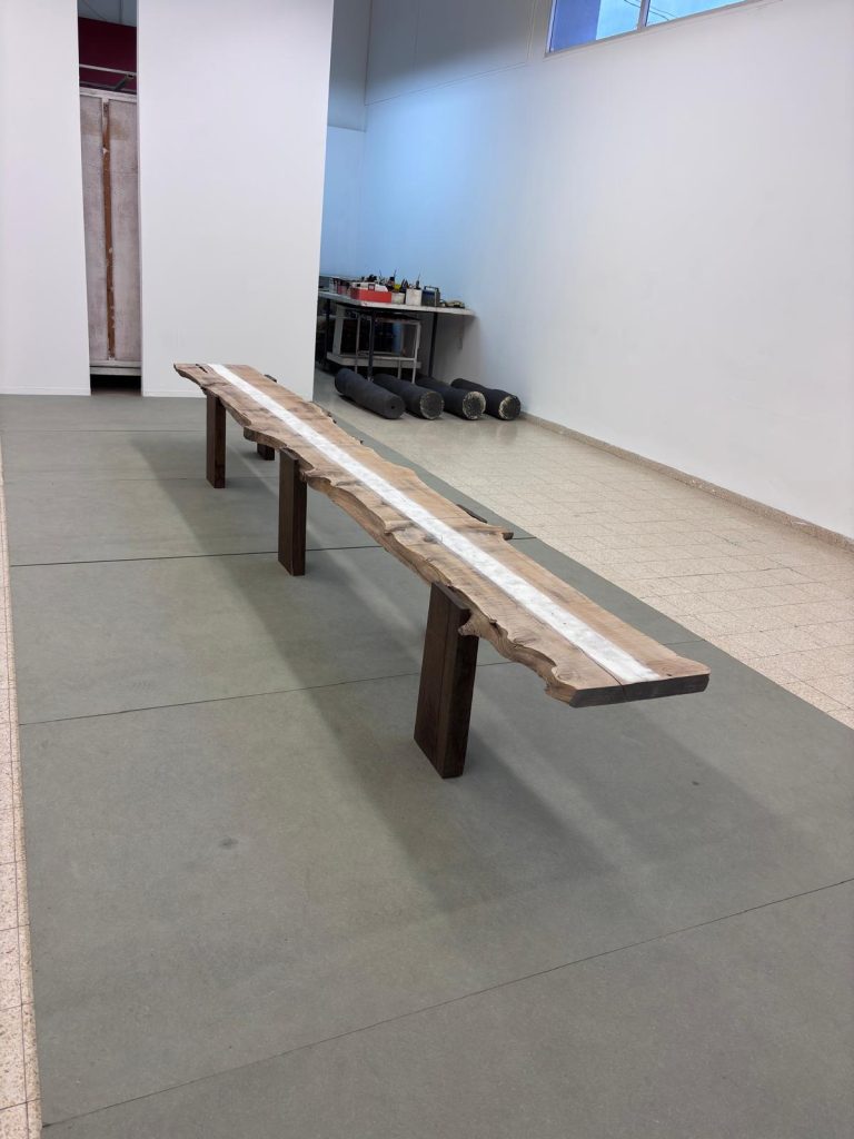 Dunietz presents the works she showed in the glass-enclosed space of the Bezalel graduate exhibition in Jerusalem, now placed in Shemi’s painting studio. A long wooden “bench” stands at the center, marked by a white line made of ground animal bones. The round black logs that extended the bench at Bezalel are placed here alongside it. The formal connection to the space is interesting: the white line is continued by a wooden line that is part of the back frame of one of Shemi’s paintings, visible through the walls enclosing a storage space.