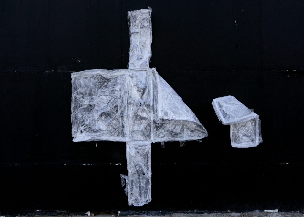 ההנגדה הזו , הפשוטה מידי חוזרת גם ביחס לעבודה של דרור היבש “מסה ריקה”, העשויה גופים שקופים למחצה מפוליאתילן ומסקנטייפ וכולה אומרת פגיעות, כאילו נגיעה בלתי זהירה תוציא את האויר , תהרוס את הצורה ותותיר ניילון משוטח וסתמי. העבודה היפה הוצגה בתערוכות אחדות שלו בשנתיים האחרונות והפכה למזוהה אתו וכאן יש תחושה מסוימת שהוורסטיליות שלה – אין חלל בו לא תתאים – נשאר כאן ברמה כזו . אפשר להכביר מילים על הקלות לעומת המשקל אך זו נשארת הנגדה כללית טובה לכל עת . צילום של יחידת “מסה ריקה” אחת, עבודה לא גדולה שתלויה על קיר בחלל מעבר, מוצלחת הרבה יותר . גופי הניילון כמו רוחות רפאים בשדה שחור מקבלים משמעות ותחושה של קור שאין לגופים השברירים המוערמים לאורך קיר ובין מרווח קיר לתקרה .