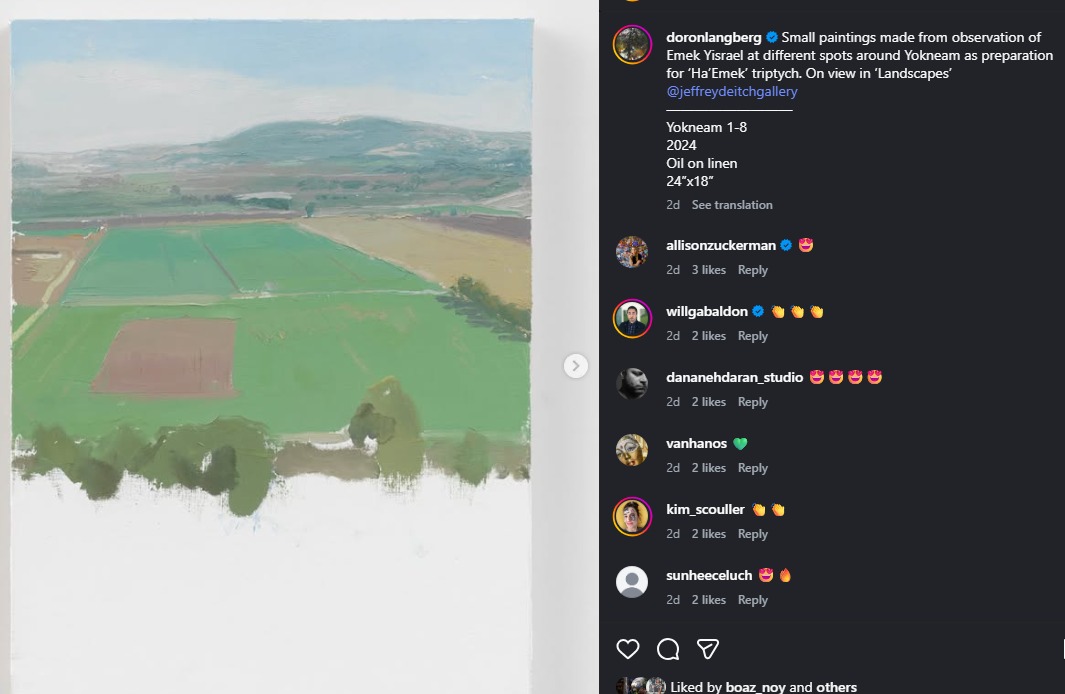 Doron Langberg, now exhibiting at Jeffrey Deitch in NY has their moment in the NYT on the ticket of the Israeli reckoning with questions of their Israeli heritage, identity and history following the Gaza war . They fuse their families horrific holocaust history with a (rather banal) observation that the town in which their parents live in Israel is peaceful while violence rages only a few hours away.