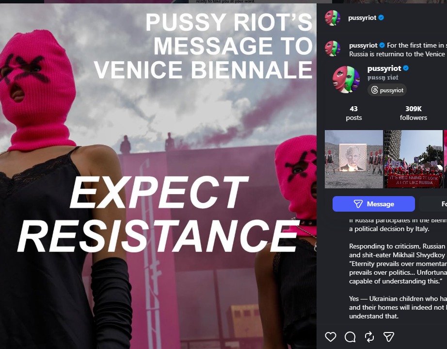 Standing firmly against these calls is Pietrangelo Buttafuoco, President of La Biennale di Venezia. Appointed in 2023 by the government of Giorgia Meloni, Buttafuoco is a right-wing intellectual who converted to Islam in 2015 and has, in recent years, expressed admiration for Vladimir Putin. It is therefore unlikely that, under his leadership, the Biennale will adopt a critical political stance. However, mounting pressure—from European institutions as well as from within the art world—suggests that the Biennale’s opening in May will be marked by significant political tension. The activist collective Pussy Riot has already declared that the Russian Pavilion will not open without protest.