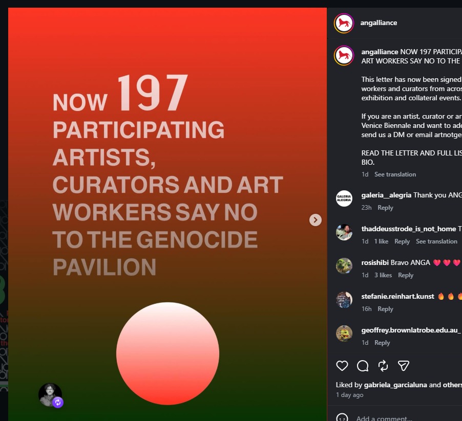 Notably, the petition against Israel has, so far, attracted relatively limited support: as of April 2, only 197 signatories (many anonymous), compared to over 24,000 signatories on the equivalent petition in 2024. Nonetheless, the initiative includes influential figures such as Rasha Salti and Gabe Beckhurst Feijoo—members of the curatorial team of the International Exhibition—as well as artists and curators representing multiple national pavilions.