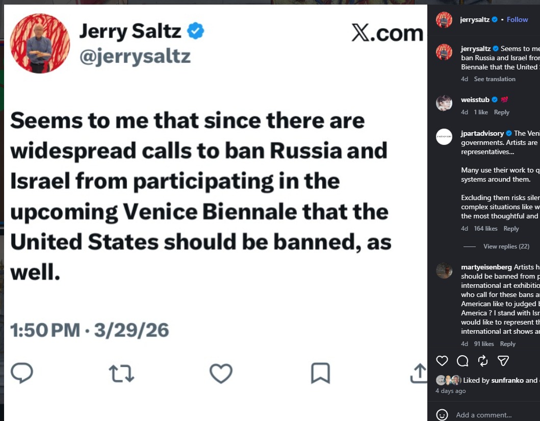 The call to boycott the American Pavilion initially emerged at the margins of the campaign against Israel, but has recently gained traction. A letter sent to the Biennale calls on its leadership to take a stance against “all regimes committing war crimes.” It is signed by 73 artists, including Alfredo Jaar and Zoe Leonard, as well as members of the International Exhibition’s curatorial team. This position was further amplified by a public statement from art critic Jerry Saltz, who also called for a boycott of the U.S. Pavilion.