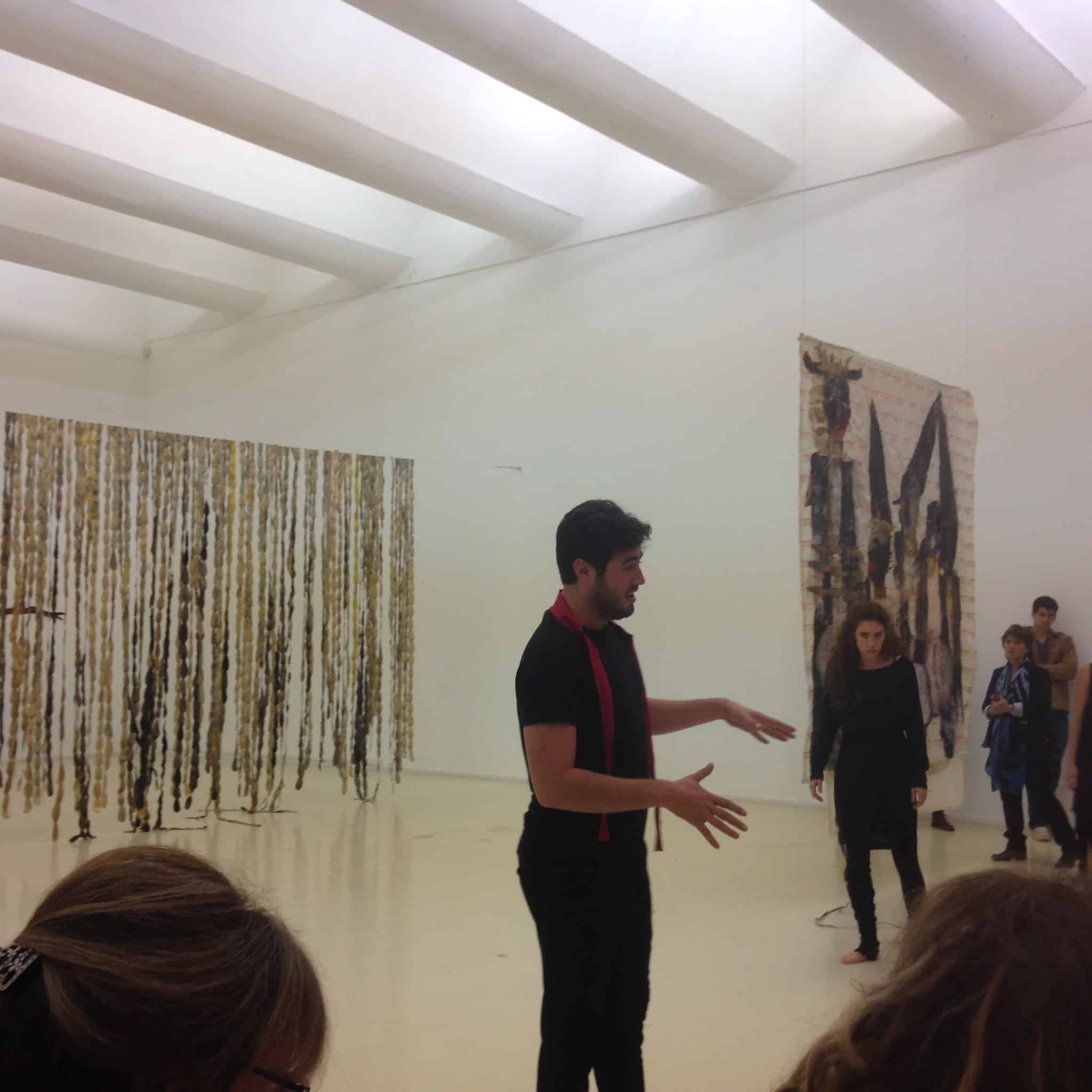 However, after all is said and done, this is a successful theatre event. The acting itself was what has become a standard style (actors within the audience, a great deal of yelling), but the texts were beautiful, making a successful transition from the 19th century to present sensitivities. The play traces the story of the raft as told by two of the survivors, as a test case – a micro-society – similar to other extreme situations of survival stories (“Lord of the Flies,” William Golding, 1954; “Robinson Crusoe,”Daniel Defoe, 1719). Issues of religious belief and society are voiced in the actors’ dialogue. The relationship between the actors’ movements within the exhibition move between feeling of a “desecration” of the sanctity of the museum space and between sheltering under the works. The aura surrounding Helbitz Cohen’s works is already compromised due to their fragmentariness and evident fragility.