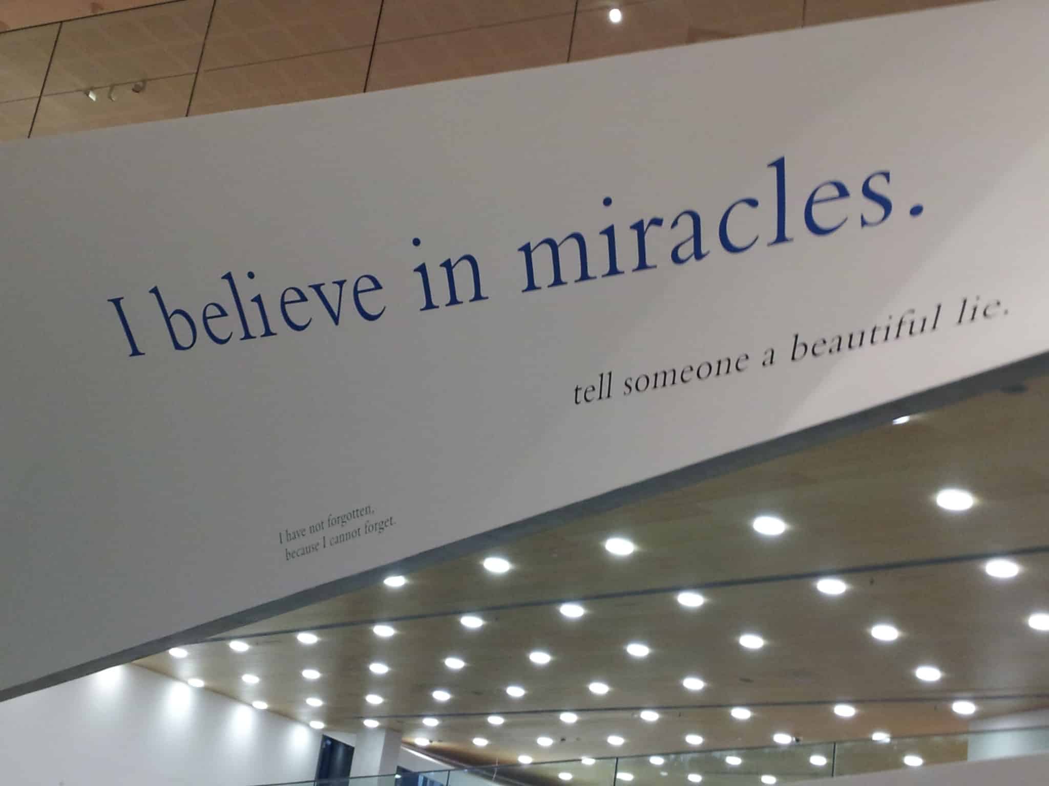 “מפל האור” פיר חלול, דרמטי שעובר למלוא גובהו של האגף החדש כוסה בגרסה לעבודה ” פחות או יותר כל מלה שנכתבה, נאמרה או נשמעה, בכוונה או באקראי,מאז 1989 ….” . שנעשתה ב 2006. מימרות ומשפטים, חלקם בעברית כמו “זכרי אותי”, ורובם באנגלית כתובים בטיפוגרפיות, צבעים וגדלים שונים. חלק על גבול התמימות או הקלישאה” I BELIVE IN MIRACLES” ואחרים כמו “I HAVE FORGOTTEN EVERYTHING” אניגמאטיים. יחד עם האור ומערבולת הכתב נוצרת תחושה של התעלות כאילו ברקע מתנגנת “האודה לשמחה” ( “Ode an die Freude”) מהסימפוניה התשיעית של בטהובן. השימוש בכתב מעלה על הדעת את הכתב כהצהרת אמונה ב”סגרדה פמיליה” של גאודי (שטרם הושלמה) שם מילים כמו “Sanctus” (קדוש) מוכפלות עשרות פעמים ויוצאות במחול באבן.