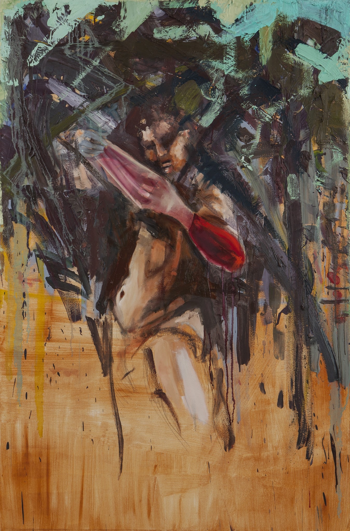 In richly painted, sensuous and conflicted works, Hirschfeld engages in pain and the deepest layers of nude flesh, as if to state that it is impossible to shed one’s identity, whether metaphorically or concretely. He paints vegetation in bold colors, in total control in which pleasure is evident, engaging in the subject of death where clothing (clearly symbolizing culture) can no longer provide protection or shelter.