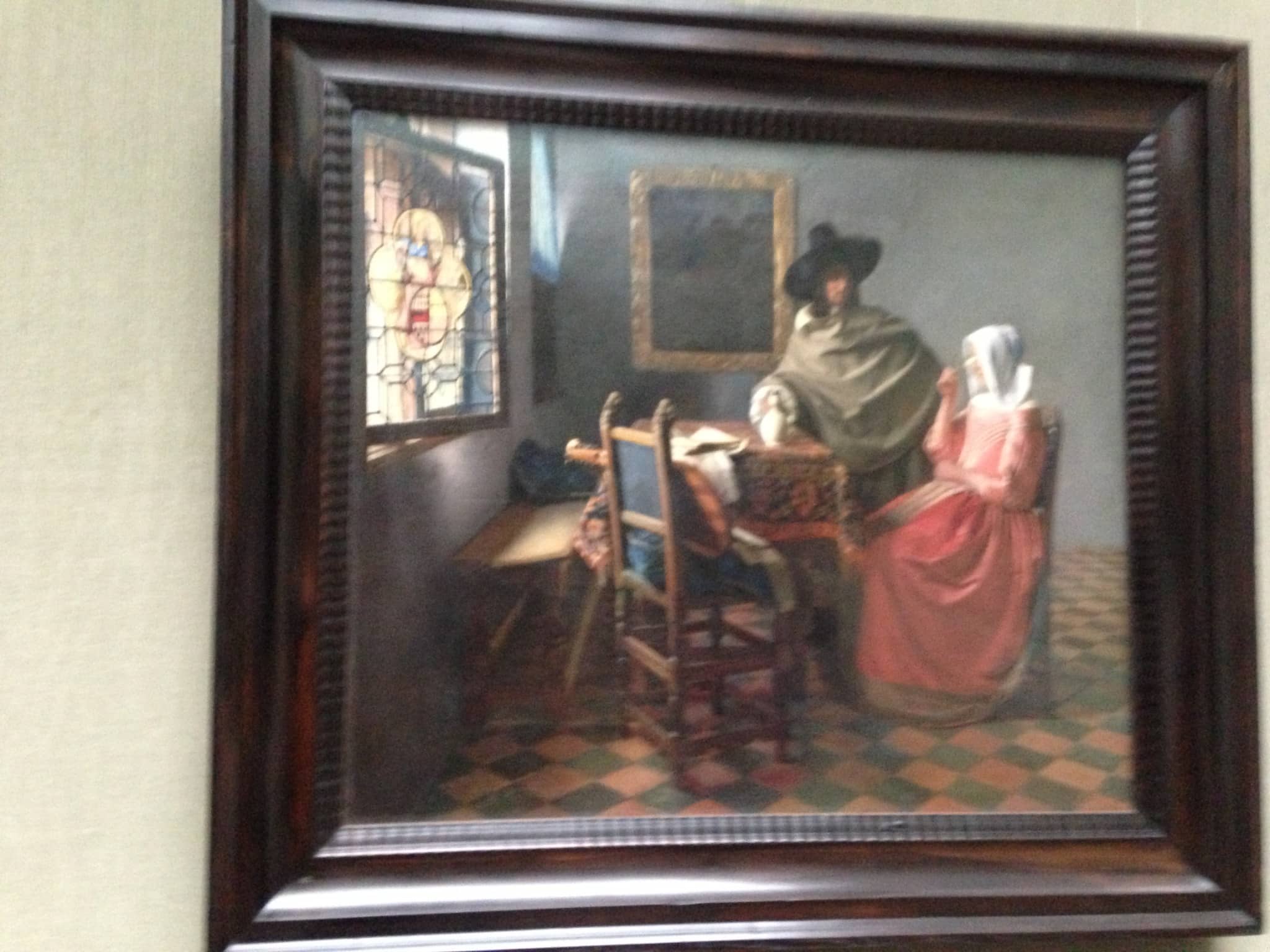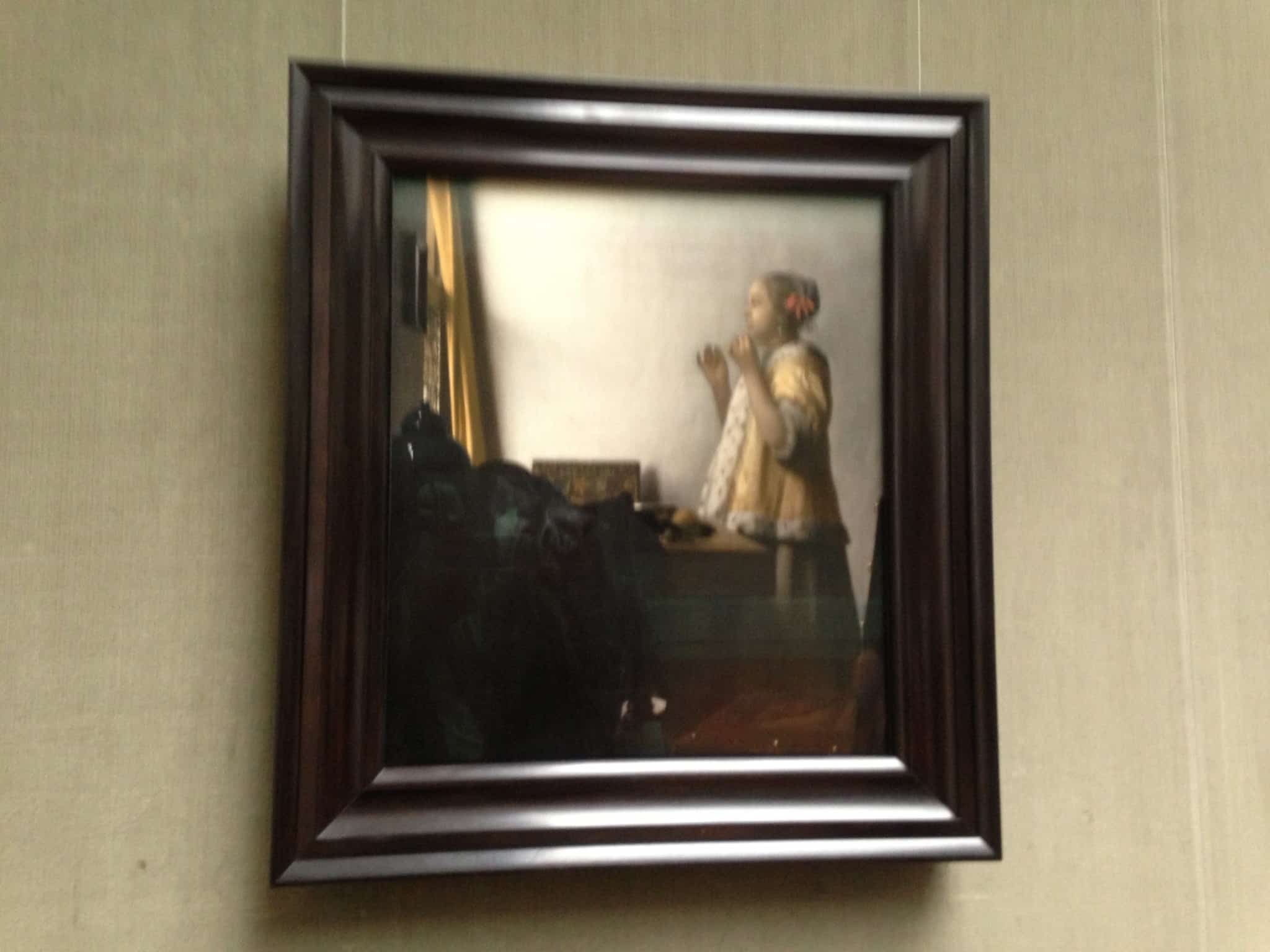בקלות לשכוח לצאת מהמקום. הפעם התמקדתי בהתבוננות בשתי עבודות של ורמייר, “כוס היין” ו”אשה עם שרשרת פנינים” (לא לבלבל עם “הנערה עם עגיל הפנינה”), 1658–1660 ששתיהן אינן נחשבות לעבודות מפתח של האמן. יש חופש בהתבוננות בעבודות שפחות כתרים נקשרו להן (יחסית כמובן, שהרי ורמייר הוא ורמייר הוא ורמייר). ליופי מלווה מתח נרטיבי וצורני: מדוע לגמה האישה את הכוס כולה במה שנראה כמחווה דרמטי? מה רואה במראה האישה שמותחת קלות את השרשרת? אי שקט מצפה להתפרץ.
