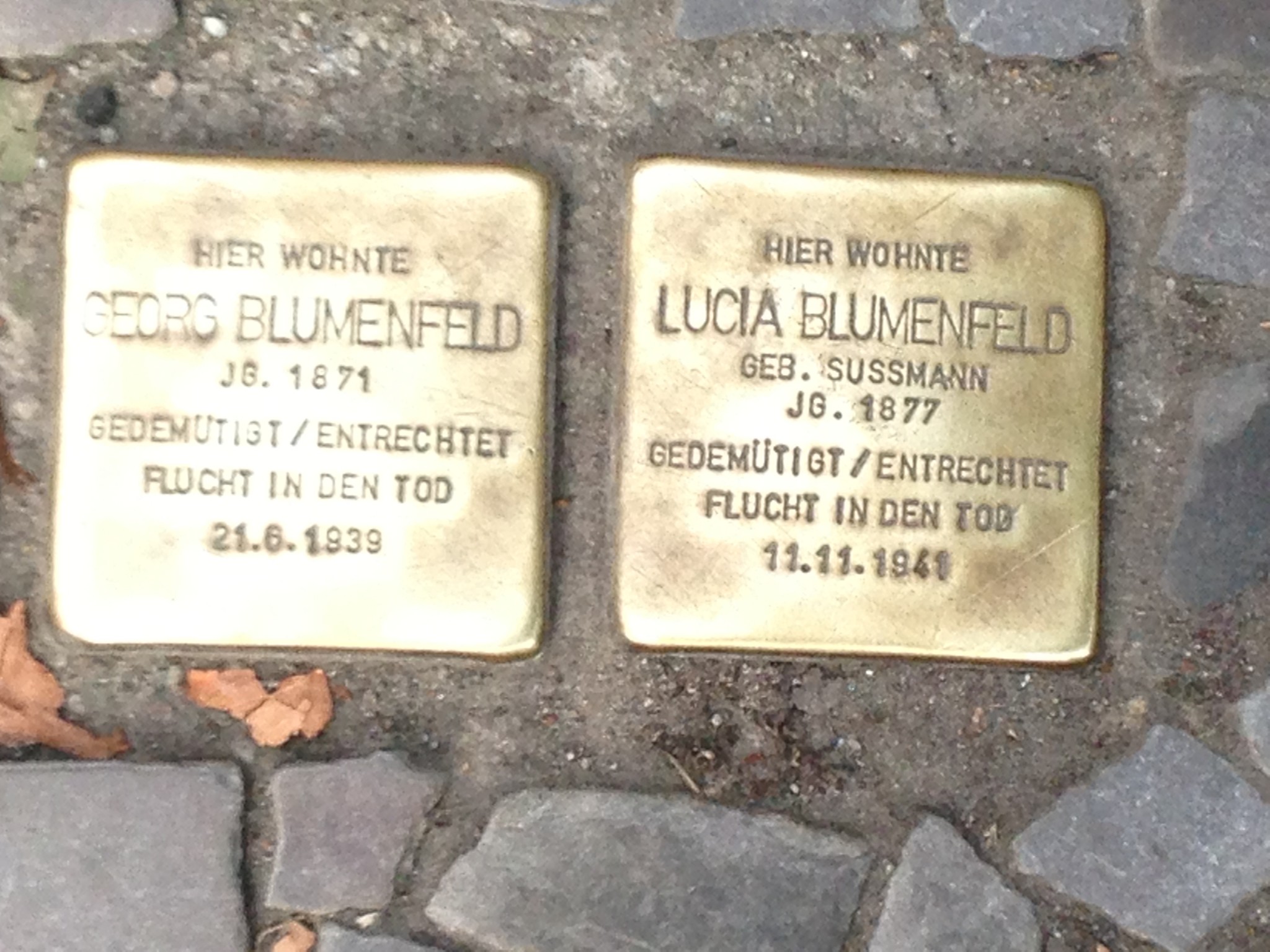 את העבר, לא כפי שהוא מצטייר אלא כפי שהיה מזכירות שתי ה”שטופלרשטיינה” Stolpersteine אבני הזיכרון במדרכה עם שמות בעלי הווילה היהודים, לוסיה וגיאורג בלומנפלד ש”נושלו, הושפלו ונמלטו למות (התאבדו)”.