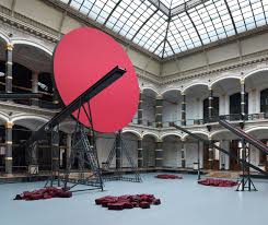 באטריום הכניסה גדול המימדים Symphony for a Beloved Sun, 2013, עבודה שאפשר לקשר ליוזף בויס (שהציג באותו אולם ב 1982) ולקונסטרוקטיביזם רוסי אבל האסוציאציה הראשונה והמידית היא לשואה, לרצח מתועש ורק אח”כ לכל השאר. במרכז האטריום גושי שעווה אדומה ענקיים שחלקם נמסו ויצרו שלוליות אדומות כדם. מהצדדים קוי יצור שחורים מוצבים כשהם מוטים לקראת הרצפה, מסתובבים כמו במפעל ועליהם שאריות שעווה אדומה. האסוציאטיבית לאוושיץ ומקומו של המודרניזם במכונת המוות עולות מעליהן. גם personnes’ עבודת הענק של כריסטיאן בולטנסקי שהוצגה בגראן פאלה בפריס במונומנטה ב 2010 ובה מנוף שהניף בקצב קבוע ערמות ענק של בגדים בשדה זרוע משטחי בגדים עולה על הדעת. (קאפור הציג במונמנטה שנה אחר כך את Leviathan).