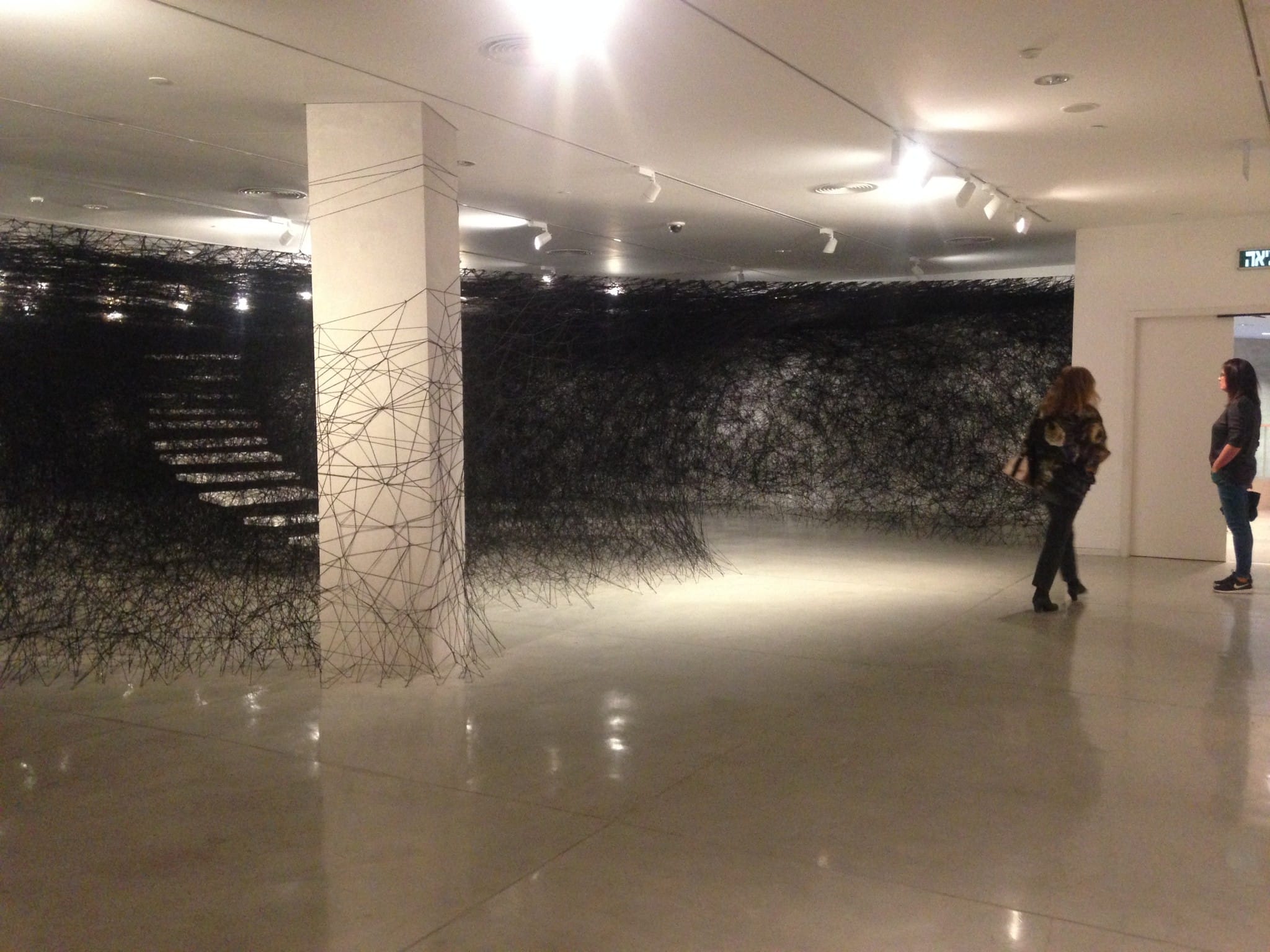 גרם מדרגות 2016/2012 המיצב של צ’יהארו שיוטה, עומד מול ההדפסים. בונציה הציגה מיצב עם חוטים אדומים, מפתחות וסירות שזכה להערכה נרחבת שלא הייתי שותפה לה. מערך הסמלים שיצרה סימן סכנה תלישות נדודים ועקירה – המפתחות והסירות ההופכות , יצר קריאה קלה והותיר אותי ללא חוויה , יותר בבחינת איור מאשר עבודה . כאן, ב”גרם מדרגות” הפואטיות, הישיריה, עובדת. במנהרה של חוטים שחורים מתוחים וסבוכים ניצבות מדרגות לבנות, מוסתרות חלקית , שמבליחות כספק הזיה . הן יכולות להיות מדרגות לגן עדן אך לא פחות מכך להיות עוד פתח מילוט מתעתע. כוחו של המיצב בשתיקתו –ניתן להכנס ולהלך בו, לגלות כמה עומק הוא מעניק למבט המתבונן מבעדו .עד כמה קוריו כשל קורי עכביש נדבקים לתודעה. שלא כמו עבודיות של פירנאזי, כאן המבוך ניתן אמנם ליציאה אך אינו מאבד את התיאטריליות הבלתי מתנצלת שלו . קשת החוטים יכולה להיות תעלת לידה או חלל שכושף והמעבר בה מרגש.