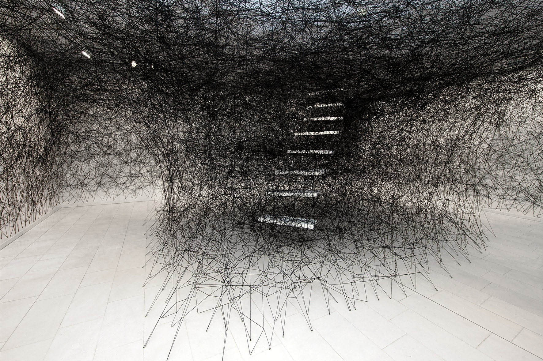 Shiota’s installation Stairway, 2012/2016, faces Piranesi’s prints. White stairs hang in a tunnel-like maze of taut black strings stretching through the space. They seem to be hidden or perhaps are an hallucination, a “stairway to heaven,” but in any case an illusory escape route.